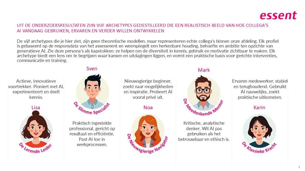 Volgens Joos zie je in elke organisatie grote verschillen in hoe mensen met AI omgaan. Tijdens zijn opdracht bij Essent werkte hij met 5 verschillende AI-archetypes. Van enthousiaste voorlopers die anderen meenemen, tot medewerkers die graag zelf experimenteren. Maar ook mensen die kritisch zijn of AI liever op afstand houden.